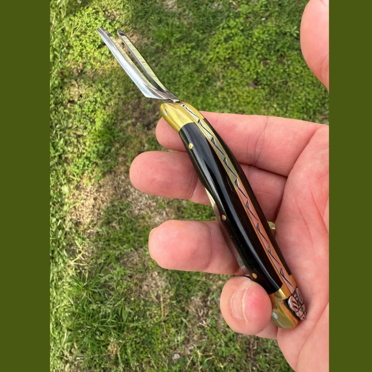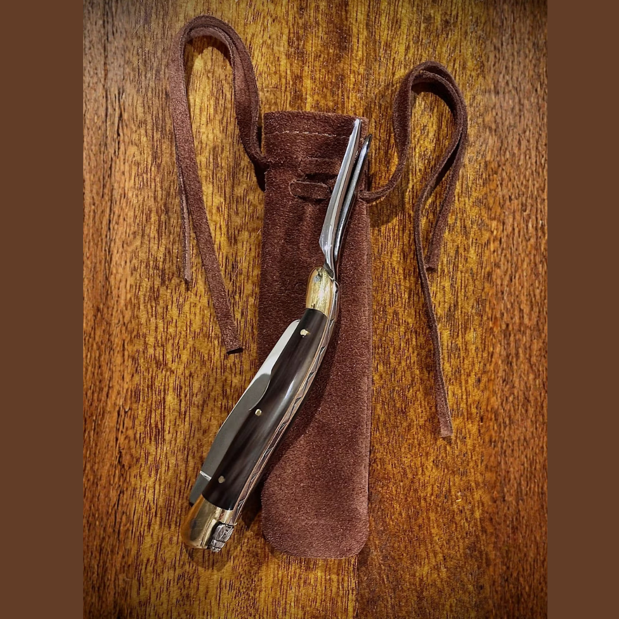 The craftsmanship is exceptional. The weight and balance are superb, and the finish reflects the handmade quality the brand is known for. The dark horn handle, with its subtle light wisps, makes this piece unique, complemented by the iconic Laguiole bee.