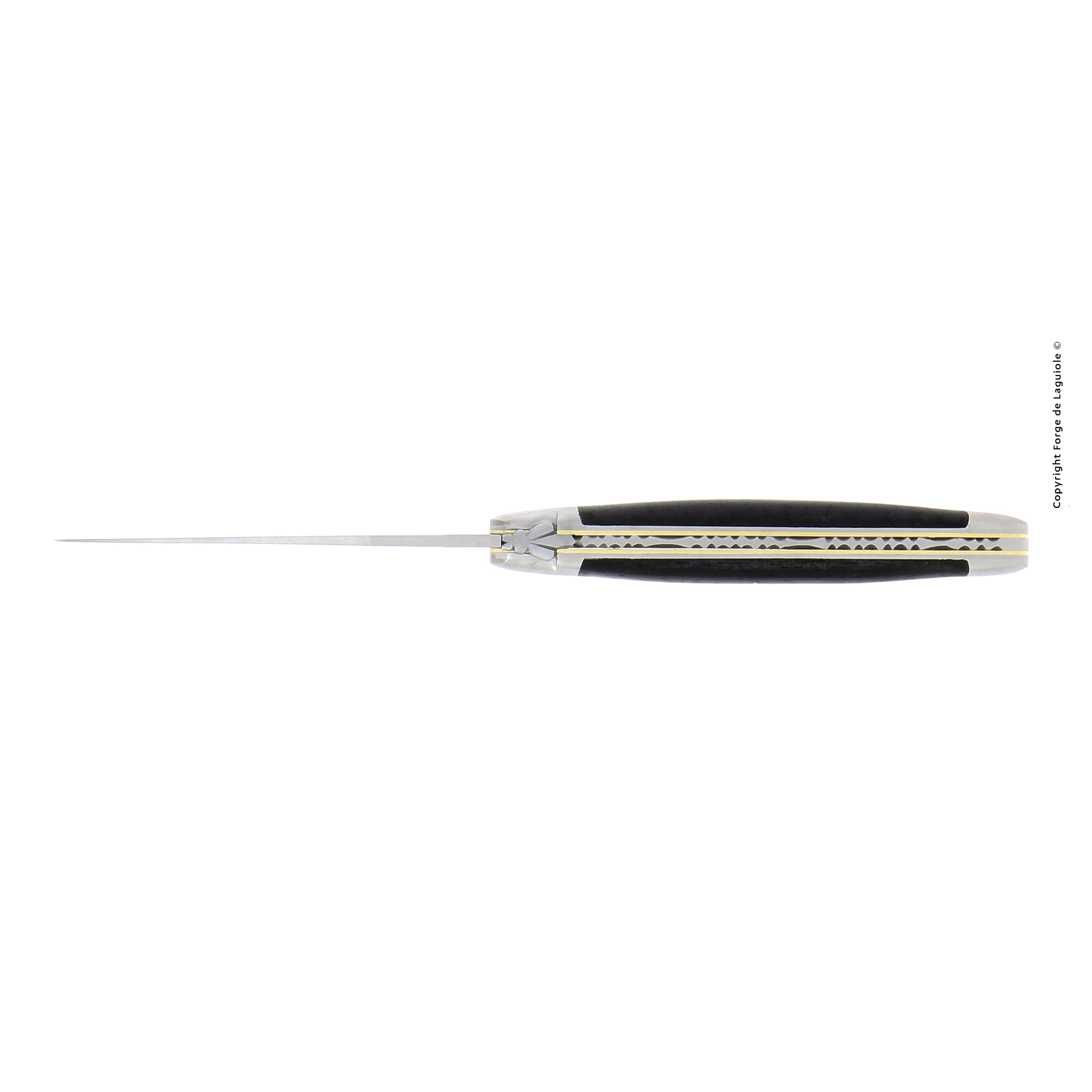 The 12 cm knife features elegant brass plates that add balance and contrast to the deep ebony handle, admired for its natural lustre and smooth texture. Paired with a satin-finish blade, this folding knife combines understated elegance with lasting durability — a timeless expression of French artistry.