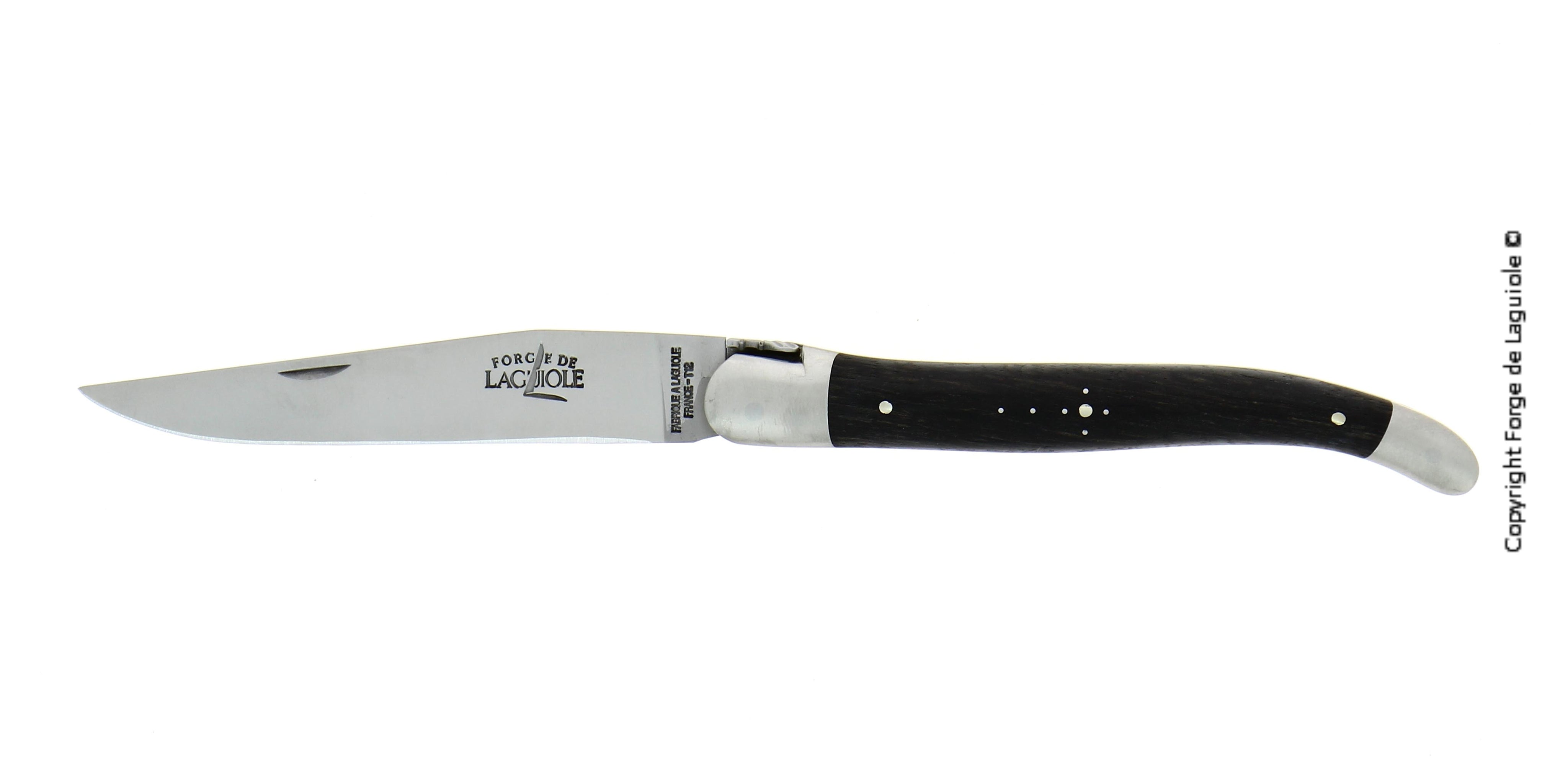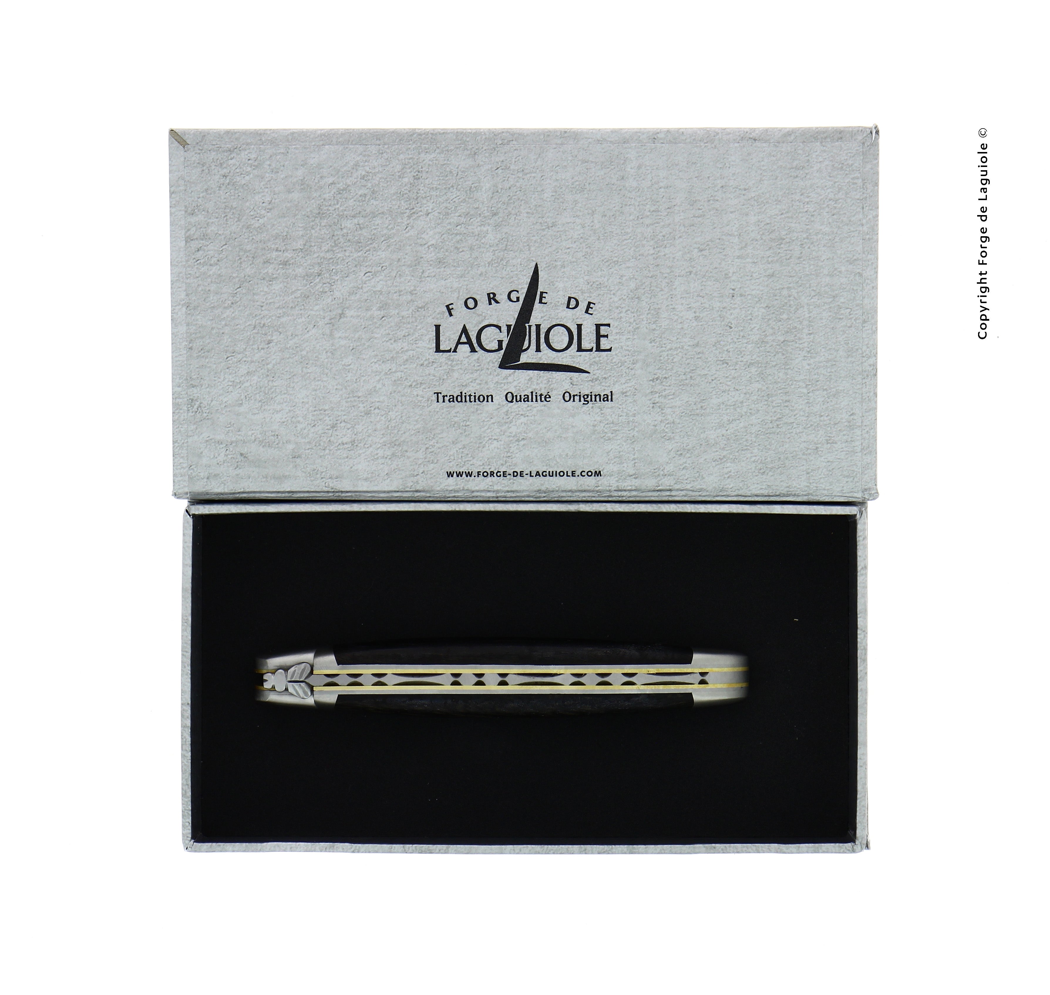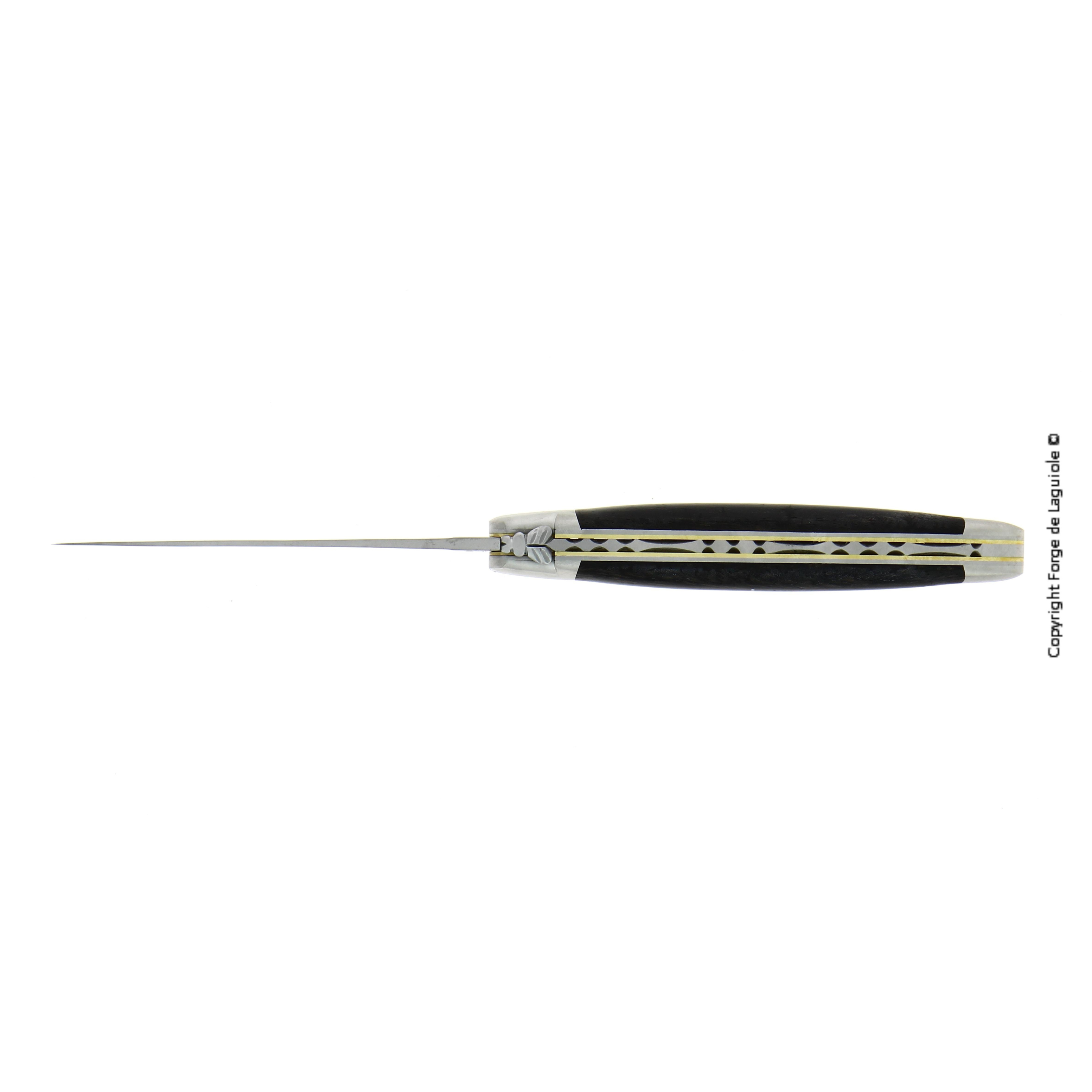 The 12 cm knife features elegant brass plates that add balance and contrast to the deep ebony handle, admired for its natural lustre and smooth texture. Paired with a satin-finish blade, this folding knife combines understated elegance with lasting durability — a timeless expression of French artistry.